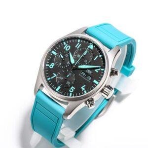 Top clone IWC Pilot’s Watch Chronograph 41 Edition “Mercedes-AMG PETRONAS Formula One™ Team” IW388108, 41mm in diameter, black dial, chronograph function with dual date display, equipped with 69385 automatic mechanical movement, double-sided sapphire glass crystal, stainless steel case and green rubber strap, exquisitely crafted, every detail perfectly replicated 1:1, global fast delivery.
