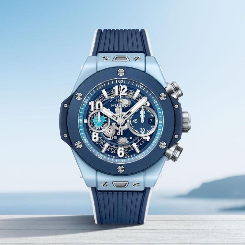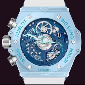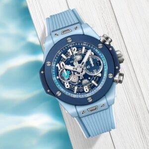 This top-of-the-line 1:1 replica Hublot Big Bang Unico Blue Ceramic Caribbean 421.EX.5129.RX.HBC25 has a 44mm diameter. The case is precisely forged from 316L stainless steel and undergoes meticulous polishing and brushing treatment. The texture is tough and exquisite.