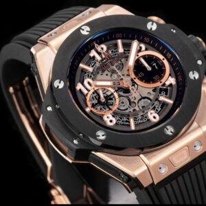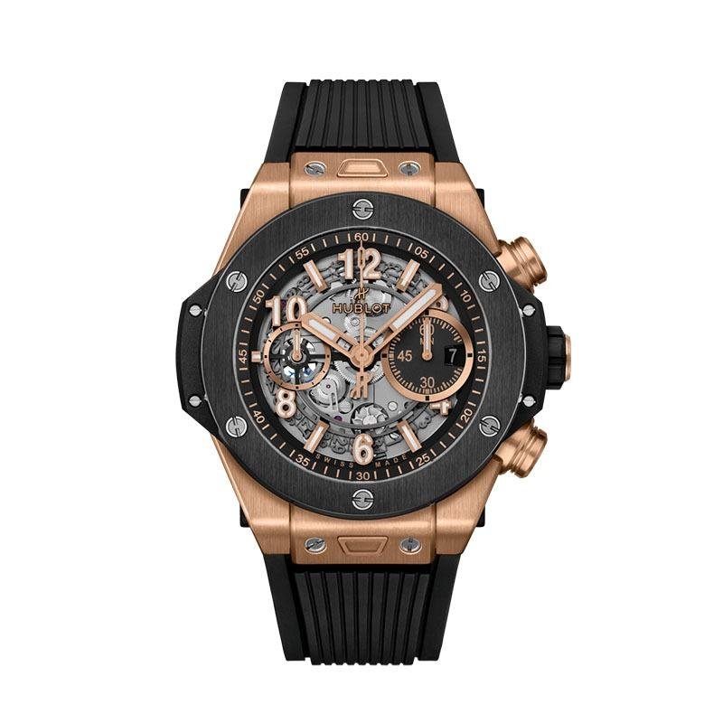 Top clone Hublot Big Bang Unico King Gold Ceramic Watch 421.OM.1180.RX, diameter 44mm, case made of 316 stainless steel, dial with overall openwork design, sapphire glass mirror, equipped The HUB1242 automatic flyback chronograph movement features a 72-hour power reserve, is exquisitely crafted with every detail perfectly replicated at a 1:1 ratio, and offers rapid global delivery.