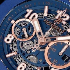 Top-of-the-line 1:1 Klon Hublot Big Bang Unico King Gold Blue Ceramic watch (Model 421.OL.5180.RX), with a large 44mm case diameter. The case is made of 316 stainless steel.